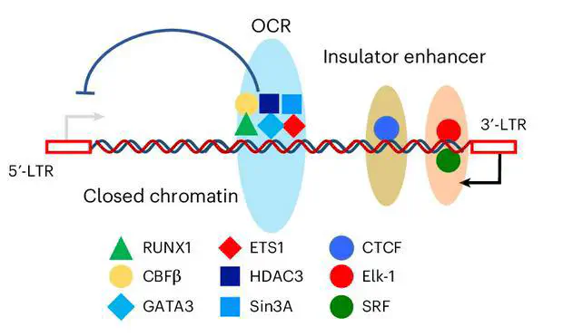 The study maps an open chromatin region inside the HTLV‑1 provirus that functions as a silencer of the 5′‑LTR. The element binds RUNX1/CBFβ, limits transcriptional bursts and antigen expression, and thereby supports viral persistence. CRISPR mutagenesis and reporter assays show that removing the element elevates viral transcripts and replication, while heterologous insertion into HIV‑1 diminishes virion output. These results uncover a host‑factor‑tethered intragenic latency module with therapeutic implications for retroviral control.
